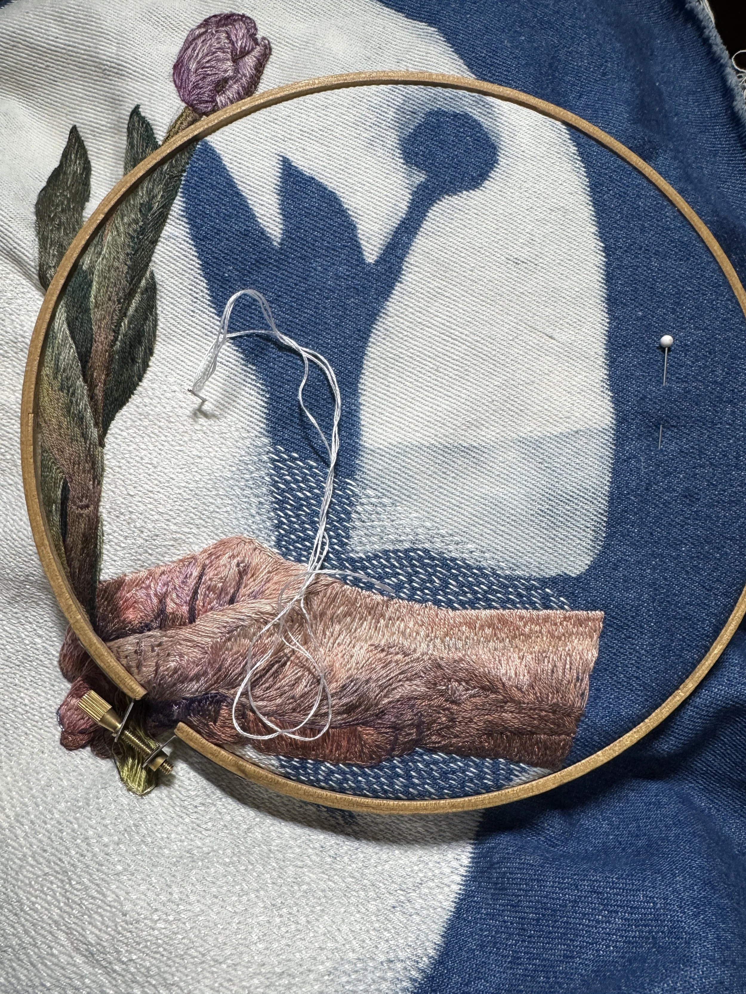 What I love about art is its ability to make things we take for granted beautiful. Like most still-life practices, my art is about romanticizing the everyday, additionally, it is a quiet resistance of concept, craft, material, and time. It is a juxtaposition of worn materials and detailed imagery. It is beauty in stillness. Hand embroidery takes hours of stitching. It is in this process of layering thread that I create work that in many ways replicates painting. However, I use a craft that is historically 'decorative’ and passed down from woman to woman. My goal is to draw people closer, for them to see the array of colors, and think, 'Wow, that's just denim and cotton thread.'